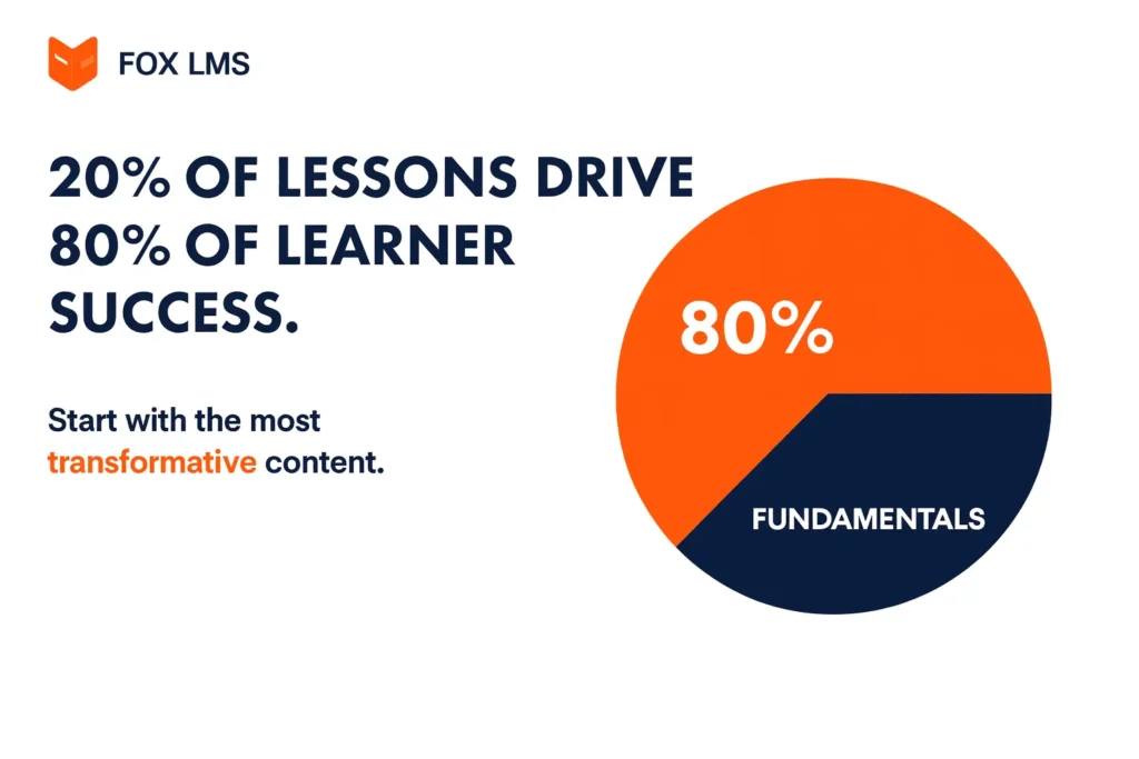 20% of lessons drive 80% of learner success. Start with the most transformative content. The 20% of your content must be the fundamentals, recurring concepts of the 80% of the course or subject knowledge. It should be your central piece and the rest revolves around that portion.