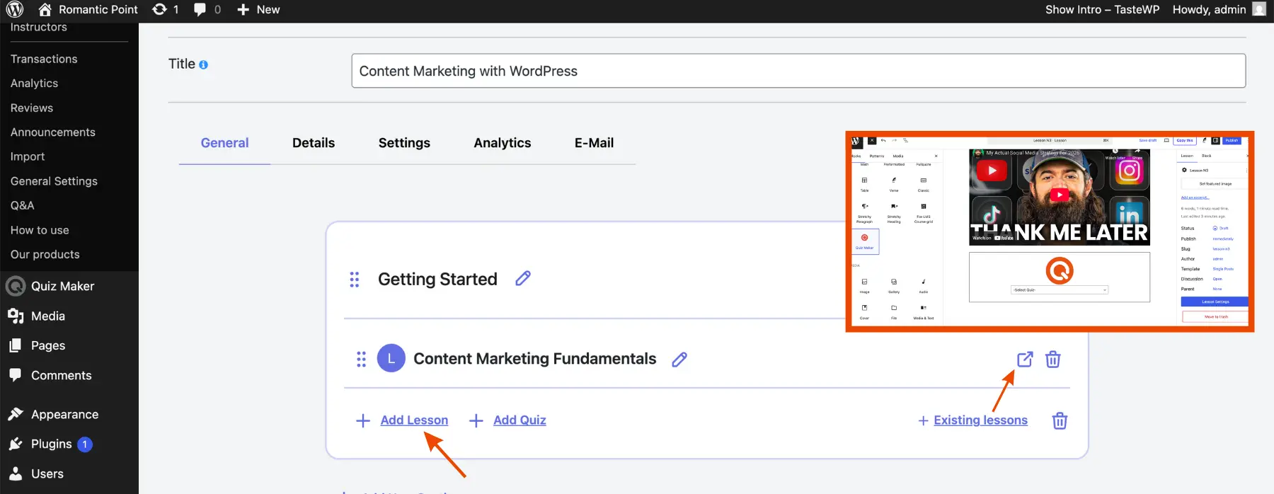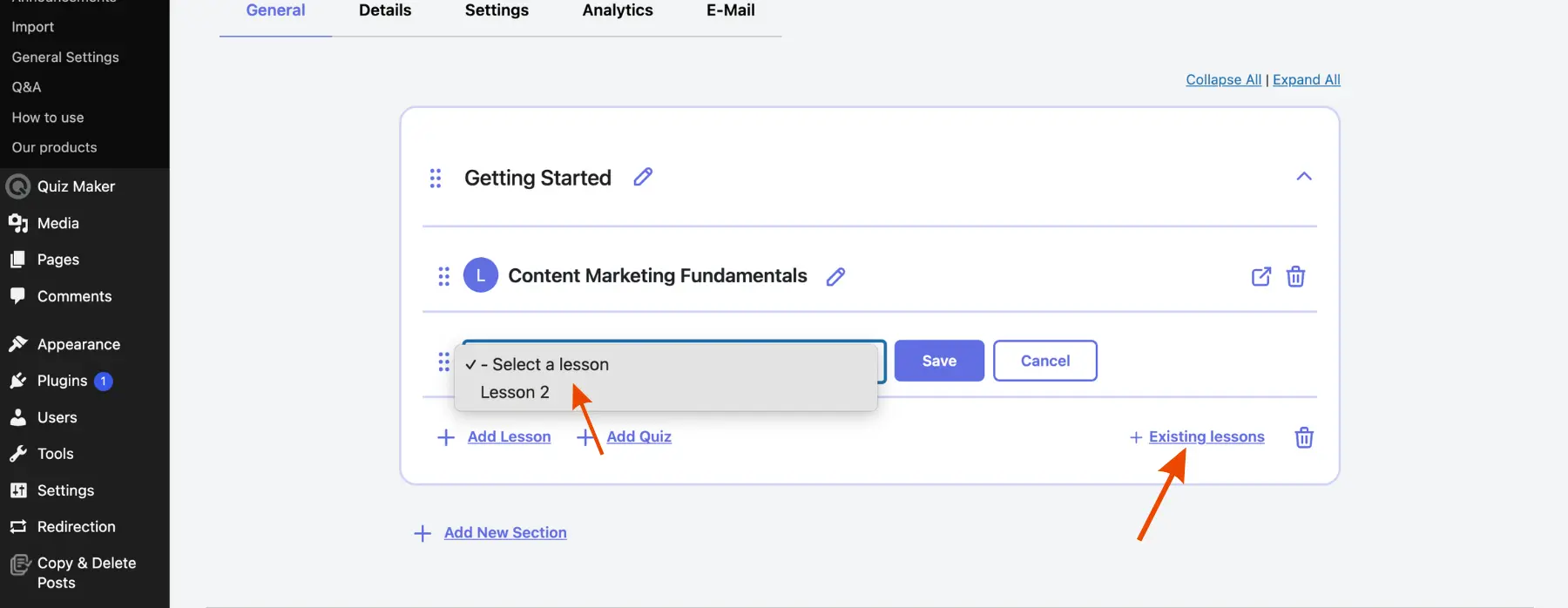 Courses split into parts. Inside every part, you’ll find lessons. There are two options to add lessons to the course page.