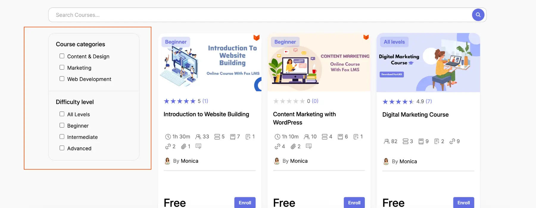 Now all your courses are displayed as a grid, with filters such as Course categories and Difficulty levels