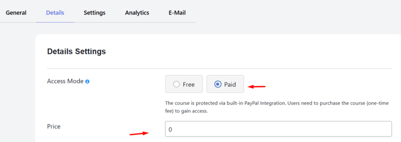 Then, navigate to the Details Tab of the given course. Choose the Paid Access Mode for the Course. Then, specify the price and other settings necessarily. Save the changes afterward.