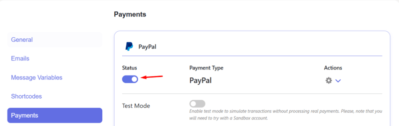 To enable the PayPal Payment method, click and activate the Status toggle.