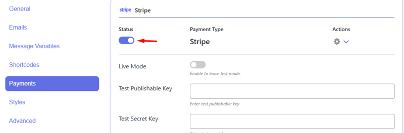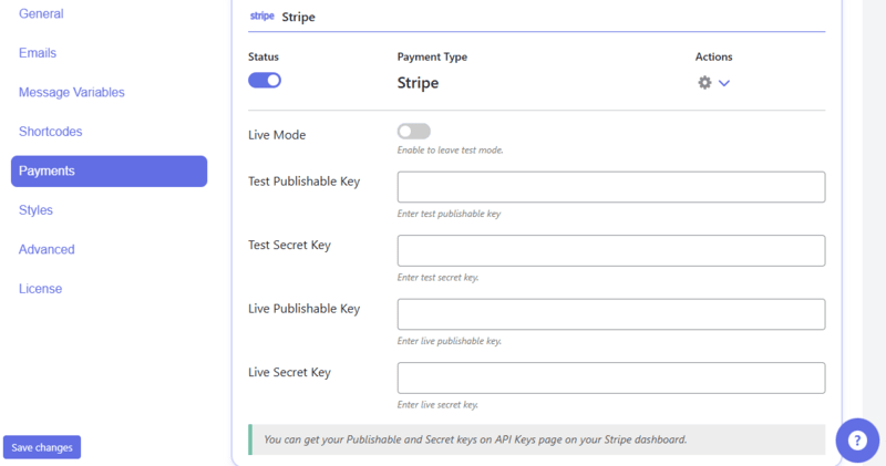 If you are using the Test mode, fill in only the Test Publishable Key and Test Secret Key inputs. If you choose the Live Mode, then, vice versa, fill in the Live Publishable Key and Live Secret Key inputs.