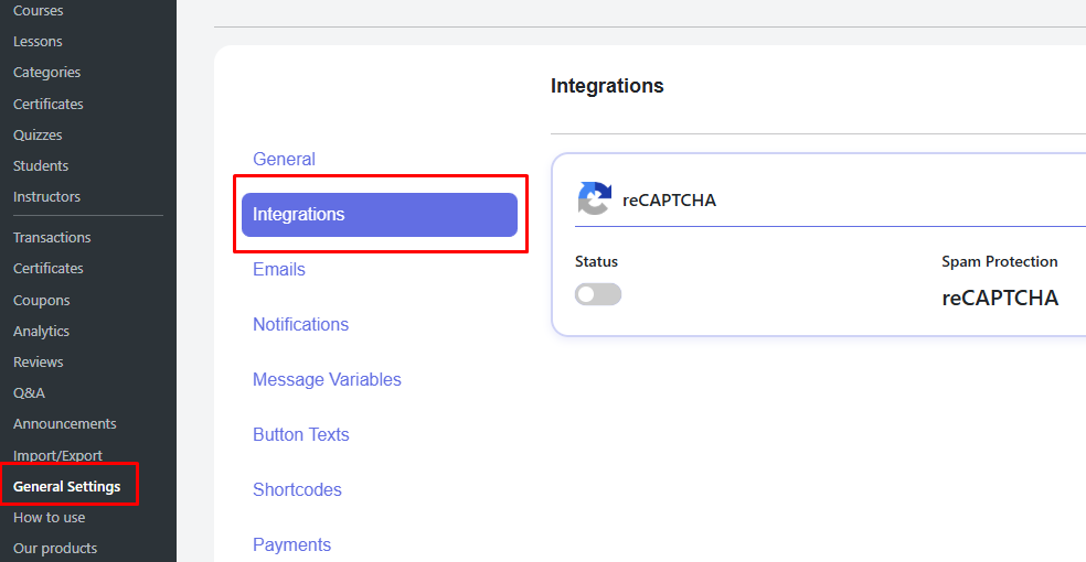 First of all, you will need to activate the reCAPTCHA. For that, you will need to move to the General Settings submenu > Integrations Tab